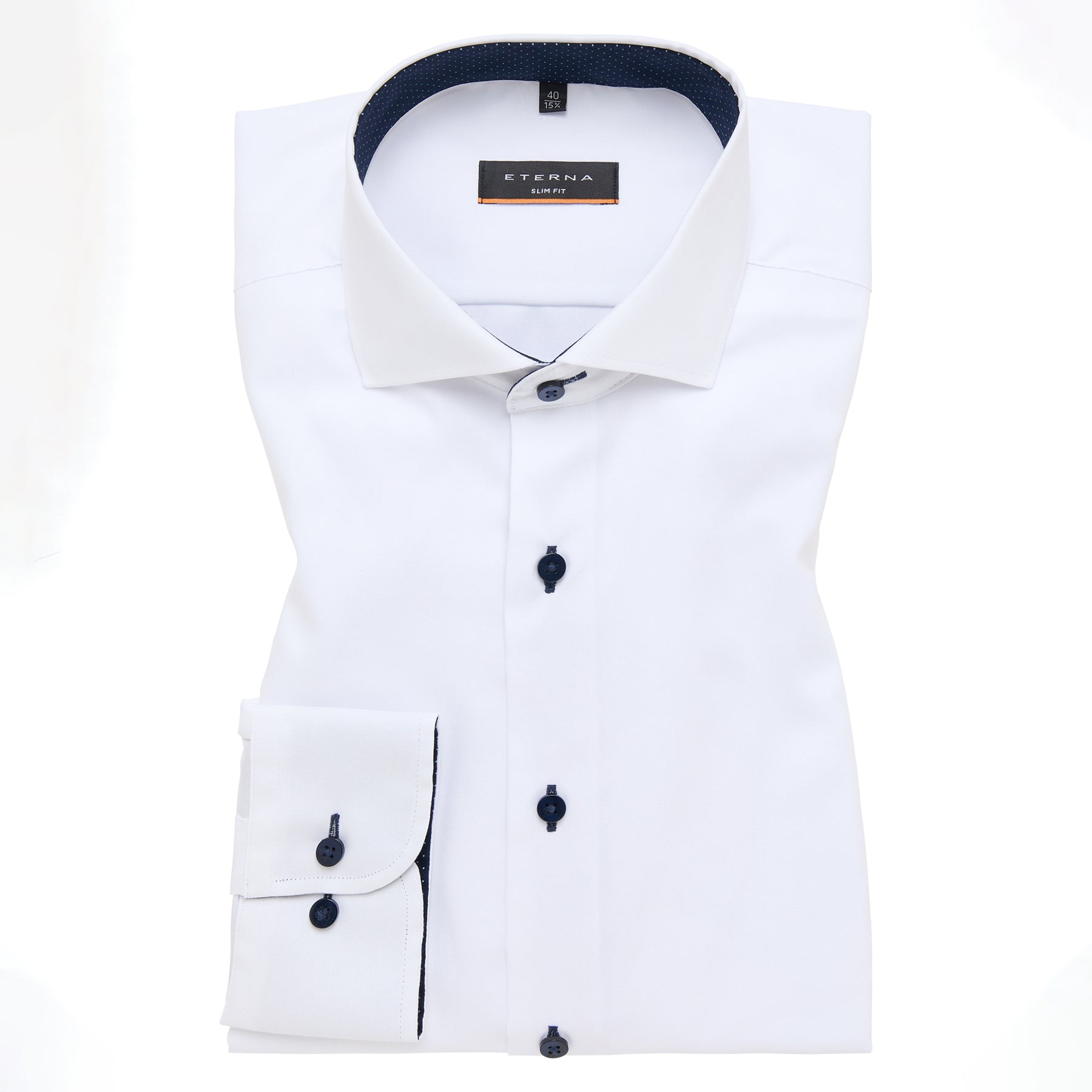 Tailored for sharp structure and everyday ease, the Eterna 1SH04634 White Slim Fit Long Sleeve Pinpoint Shirt blends crisp detailing with comfort-driven performance. Cut in a slim silhouette with a shark collar, this piece offers a modern profile with subtle contrast accents.
