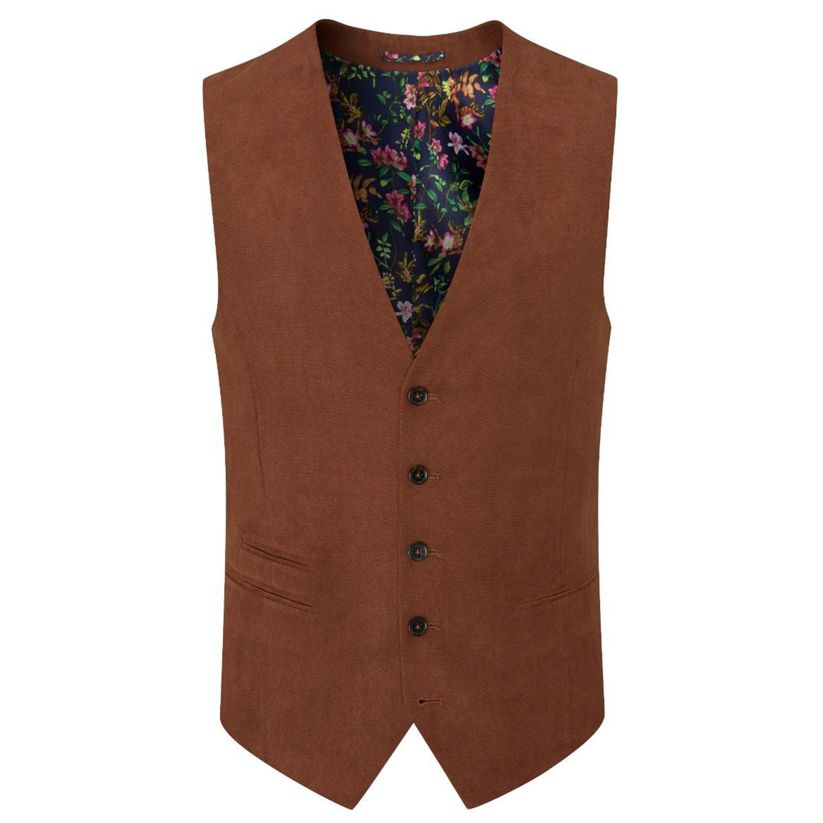 A countryside classic with tailored charm, the Baks 99MM1541 Ginger Brown Waistcoat blends soft suede-effect texture with structured polish. Its warm ginger tone and floral print lining offer a refined layer for smart-casual or formal edits.